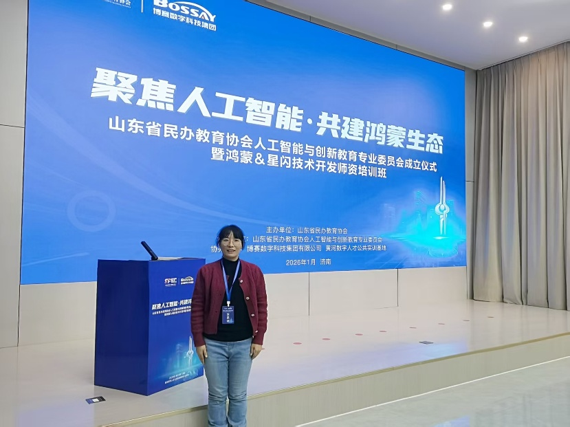 为紧跟万物互联时代技术发展趋势,推动人工智能与创新教育深度融合,加强鸿蒙生态人才培养,2026年1月16日至18日,由山东省民办教育协会主办的“人工智能与创新教育专业委员会成立仪式暨鸿蒙&星闪技术开发师资培训班”在济南黄河数字人才公共实训基地成功举办。我院信息工程学院骨干教师付娜参加此次培训,深入学习了鸿蒙与星闪前沿技术,为学院相关课程建设与人才培养注入新动力。