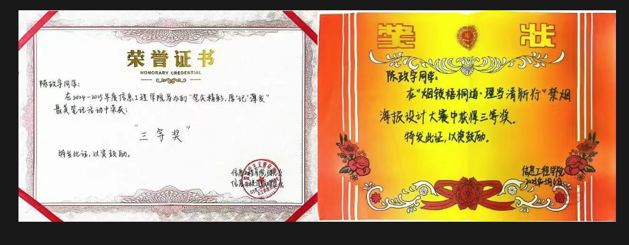 烟台理工学院为学生搭建了展示自我风采的平台,陈政宇也在这片沃土上绽放青春。自入学以来,他积极参加院校组织的各项活动。曾当选信息工程学院大学生科技节、迎新晚会、读书分享会活动主持人,在烟台理工学院禁烟海报设计比赛活动中, 获得三等奖。此外,他积极报名参加短视频大赛、最美笔记等活动,并取得了较好的名次。