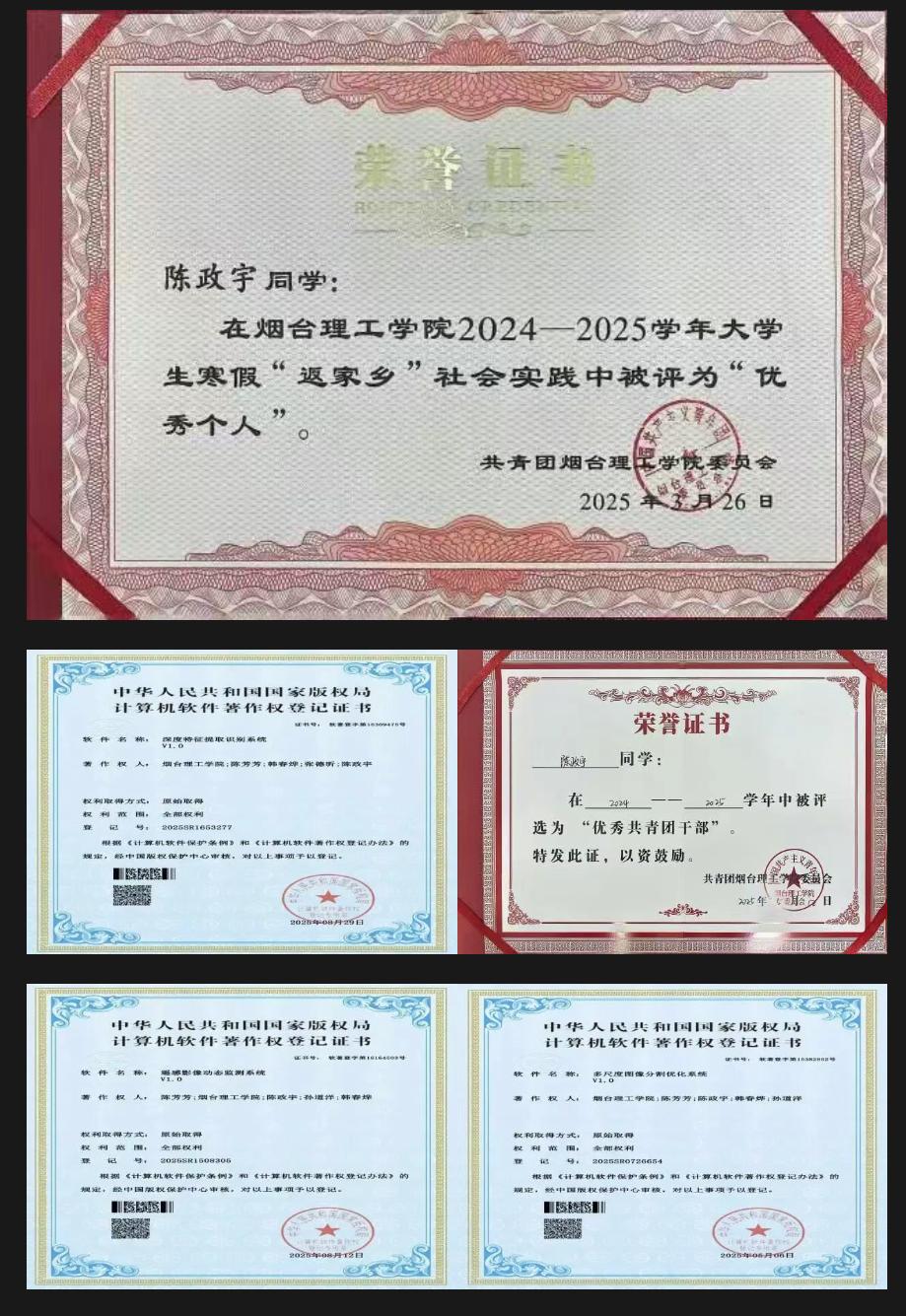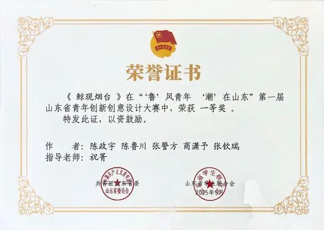 在第一届山东省青年创新创意设计大赛中,他结合计算机专业优势,凭借独特的创意视角、扎实的设计功底与对城市形象的精准把握,作品在众多参赛作品中脱颖而出,成功斩获省级一等奖,为学校赢得荣誉的同时,也诠释了当代青年对城市形象的思考与担当。此外,他依托扎实的专业知识,成功申请3项软件著作权,将理论知识转化为实际创新成果,彰显了较强的创新实践能力。
