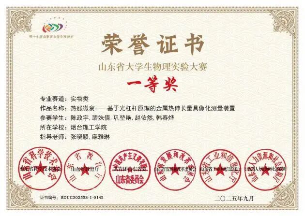 2.第十七届山东省大学生物理实验大赛省级一等奖
