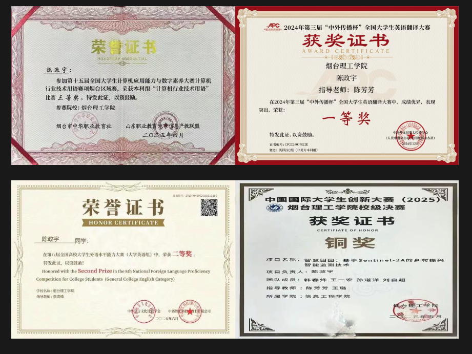 陈政宇始终以“以赛促学、以赛强能”为目标,主动投身各类学科竞赛,在实战中锤炼专业本领、激发创新潜力。