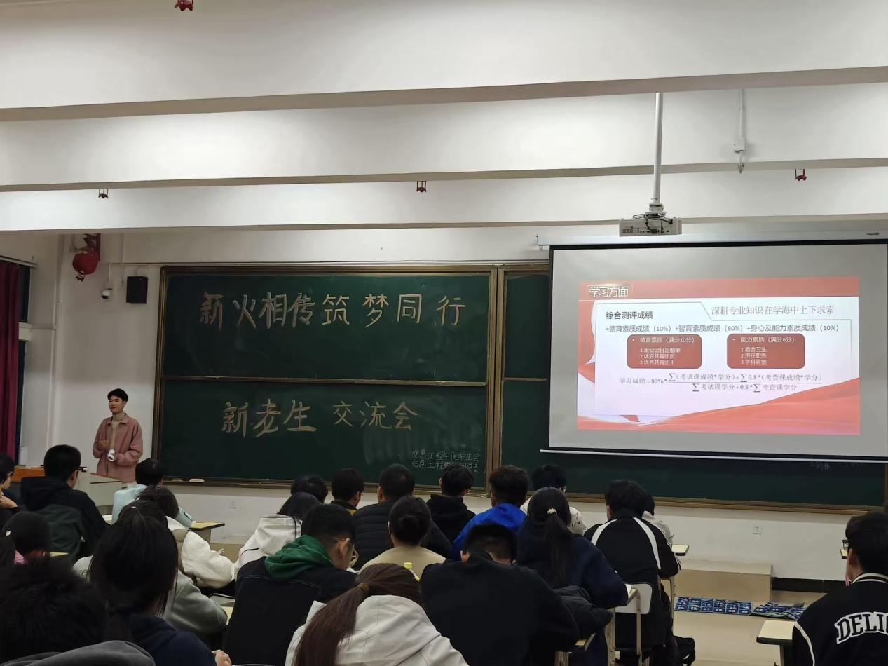 为助力新生快速融入大学生活、明晰学业规划,同时以朋辈力量传递成长智慧、夯实学院学风建设,10月27日晚,信息工程学院于教室举办“薪火相传,筑梦同行”新老生学习交流会。23级、24级优秀学生代表及25级所有同学到场参加交流。