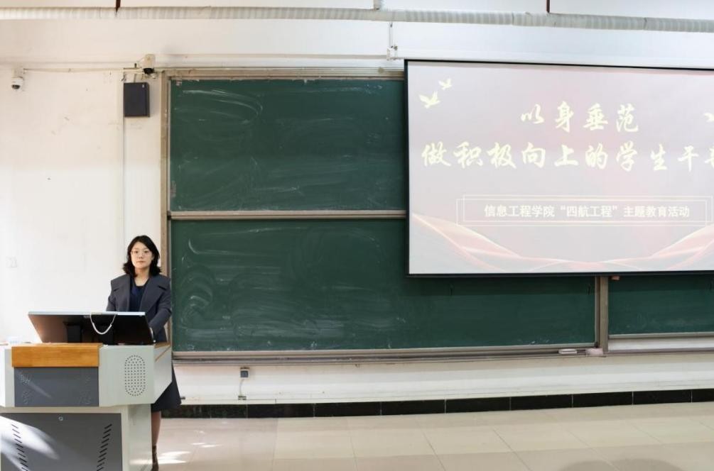 为加强学生干部的使命担当与模范引领作用,夯实学生组织队伍建设,11月10日,信息工程学院举办“四航工程”主题教育活动。学院团总支书记祝箐主讲,党总支副书记王明印、全体辅导员及学生干部代表参加。