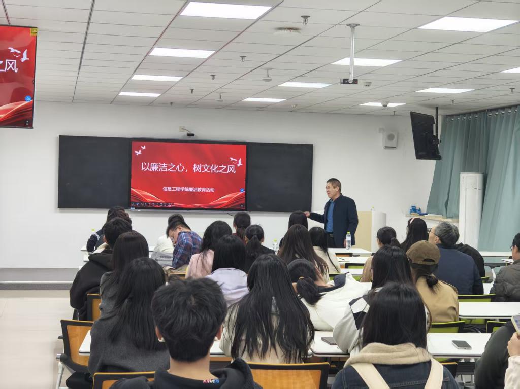 为进一步加强学院廉洁文化建设,提升师生廉洁自律意识和风险防范能力,近日,信息工程学院组织开展了廉洁教育主题活动。本次活动由学院党总支副书记王明印主讲,学院全体教职工参加。