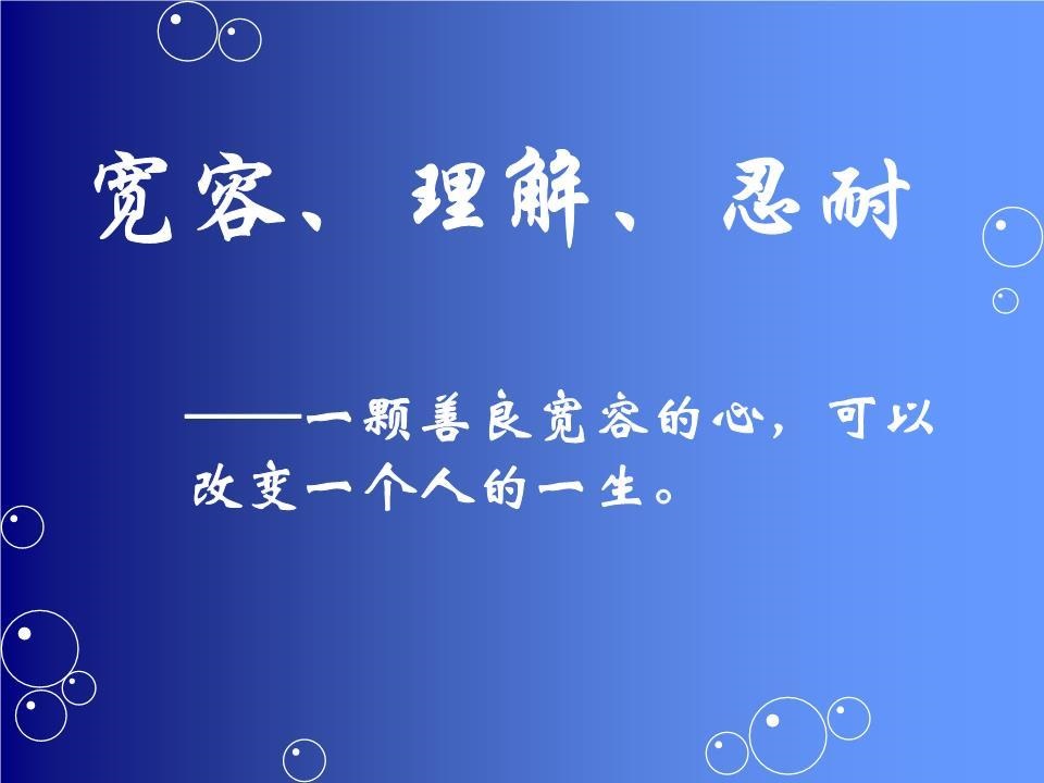 宽容,使友谊变得亲近,宽容,使亲情变得深厚,宽容,使社会变得和谐美丽。凡事包容,凡事相信,凡事盼望,凡事忍耐。人的一生中会遇到不顺心的事,会碰到不顺眼的人,如果你不学会宽容,就会活得很痛苦,活得很寂寞。宽容是慈爱,是智慧,宽恕是一种溶剂,一种相互理解的润滑油。宽容像一把伞,它会保护你,帮助你在雨中前行。